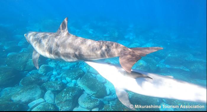 The suckling behavior of a wild Indo-Pacific bottlenose dolphin. (Photo provided by Takashi Hayakawa, © Mikurashia Tourism Association)