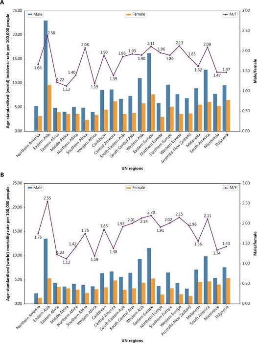 The research draws from the GLOBOCAN 2022 database and CI5 volumesX-XII, revealing an estimated 968,000 new cases of gastric cancer and 660,000 deaths globally in 2022 alone. East Asia remains the epicenter of the disease. Males have higher mortality rates thanwomen across all geographic regions.