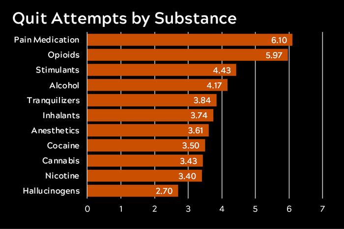 Notably, substances with a higher number of quit attempts were also those that can bring on severe physical symptoms of withdrawal, such as pain, nausea, and anxiety.