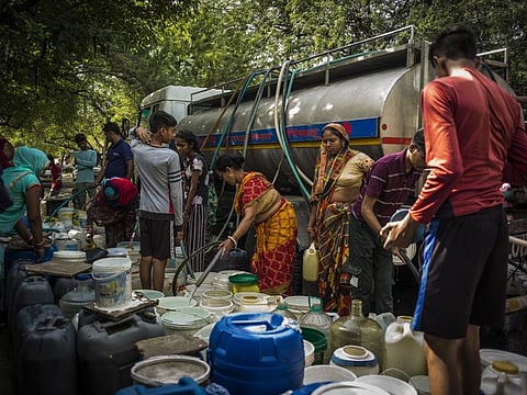 Residents fill water from a Delhi Municipal Corp. truck in New Delhi on a sunny day.