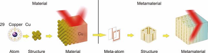 The copper itself can only show a strong reflection when a light beam is incident onto it. However, once the copper is made into wire and split-ring resonators (SRRs), which respectively have negative permittivity and permeability values, the composed metamaterial exhibits negative refraction, which is a phenomenon that does not exist in nature.