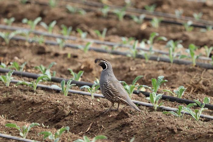 A California quail walks among kale seedlings. A UC Davis study found that bird poop from small birds are unlikely to pose a food safety risk for growers.