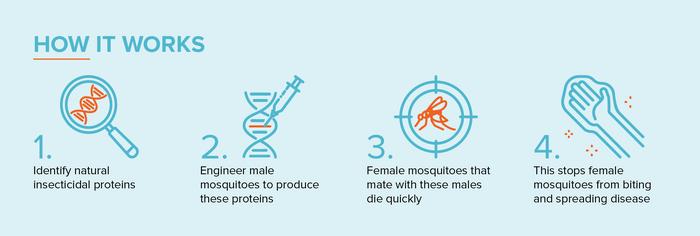It works by genetically engineering male insects to produce insect-specific venom proteins in their semen. When these males mate with females, the proteins are transferred, significantly reducing female lifespan and their ability to spread disease.