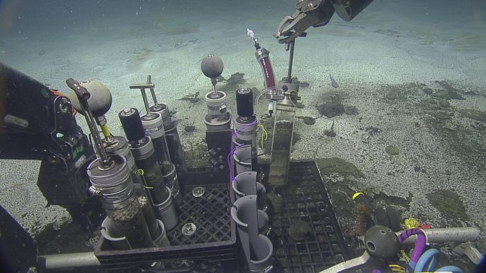 At depth, the team utilized modified push cores, or injector cores, to infuse a portion of the samples with a preservative (visible with red dye). These were then brought to the surface for gene-expression analyses to determine their metabolic pathways.