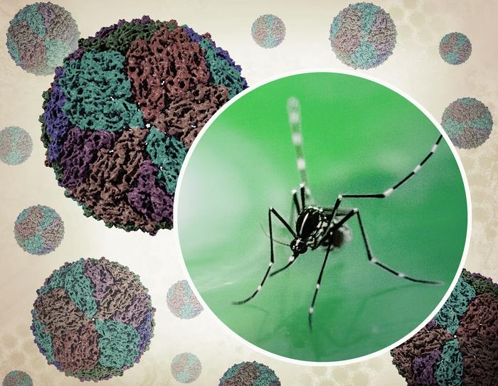 A creative layout featuring a photo of an Aedes mosquito, which can transmit the dengue virus, and cryoelectron microscopy renderings of mature dengue virus particles. Groups of dengue virus particles (beige) captured through transmission electron microscopy (courtesy CDC) appear faintly in the outer background.