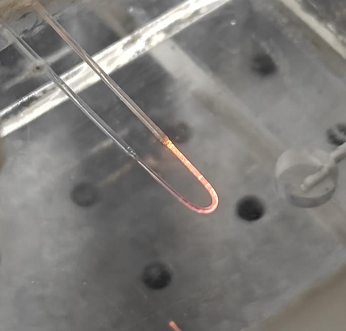 To make the new sensor, the researchers coated the inside core of a fiber with gold nanoparticles and a thin layer of a unique nanocomposite composed of aluminum oxide and graphene oxide, which selectively binds to arsenic ions. A portion of the light traveling through the core also extends into the surrounding fiber cladding due to the evanescent wave created by total internal reflection. By removing the cladding in a small section of the fiber, the evanescent wave is exposed to the environment.