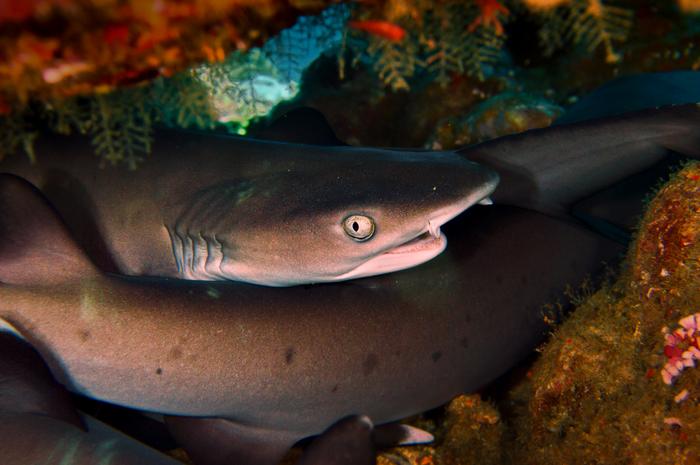 Fig. 1: A group of whitetip reef sharks (Triaenodon obesus) resting under a table coral off the coast of Indonesia, one of the world's current hotspots of cartilaginous fish diversity.