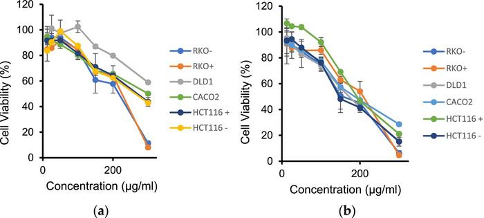 Inhibitory effect escalating concentration of A. herba-alba extract on cell viability of various colon cancer cell lines after (A) 24 h and (B) 48 h of incubation.