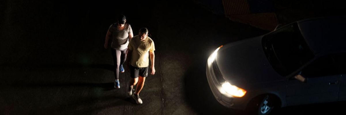 People cross a dark street in San Juan, Puerto Rico after a major power outage hit the island on December 31, 2024.