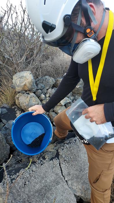 Collecting volcanic ash samples during the 2021 eruption of the Cumbre Vieja volcano in the Canary Islands.