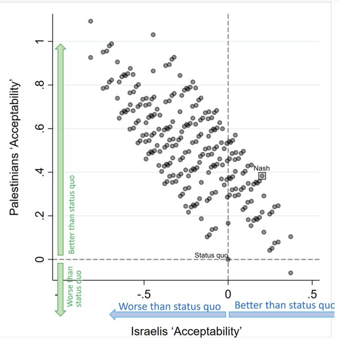 Acceptability of 256 prospective peace agreements for Israelis (x-axis) and Palestinians (y-axis). Point (0,0) is the status quo.