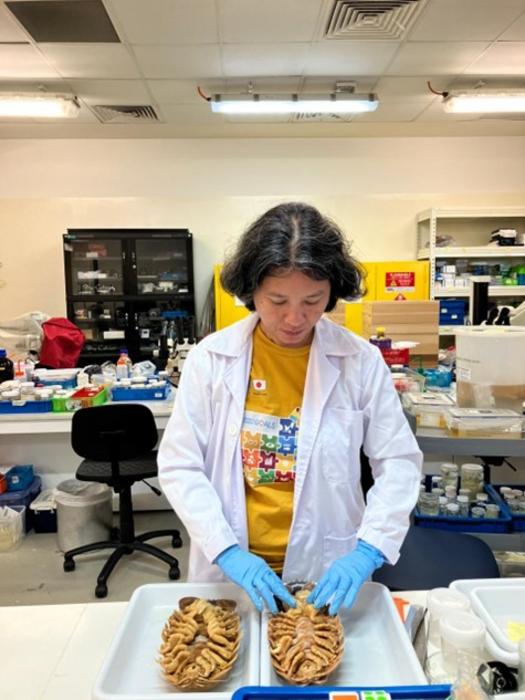 Dr. Conni Sidabalok examining individuals of Bathynomus vaderi at Lee Kong Chian Natural History Museum, Singapore.