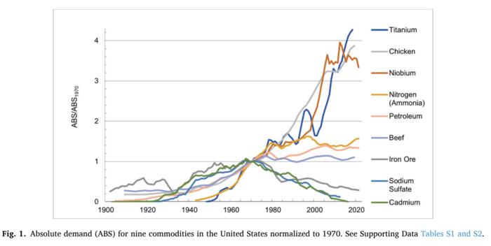 The study divides commodities into three groups based on consumption trends between 1970 and 2020. In the first group, only 8 commodities saw demand rise faster than economic growth. In addition to the trio of metals important for superalloys already mentioned, this group includes the high-tech metal titanium, essential for aerospace and military applications. It also includes the high-tech protein, chicken, whose production soared thanks to efficiencies in poultry farming and dietary shifts.