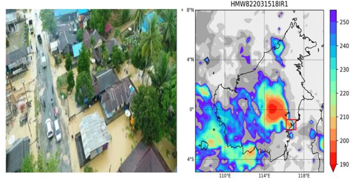 (Left) Devastating flash flood in Indonesia's new capital, Nusantara (IKN), on March 16, 2022. (Right) Mesoscale Convective System (MCS) structure during the event, shown using brightness temperature data from the Himawari-8 satellite.