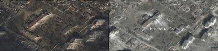 Mariupol Maternity Hospital on March 18, 2022 (left) and March 29, 2022 (right). Republished from Maxar Technologies Inc. under a CC BY license, with permission from the US Department of State, original copyright ©2022 MAXAR.