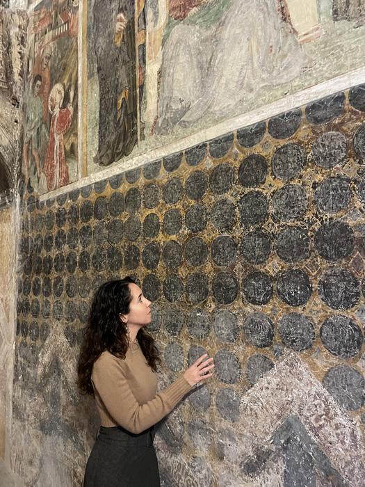 Dr Federica Gigante in front of the fresco in the Church of S. Antonio in Polesine, Ferrara, Italy