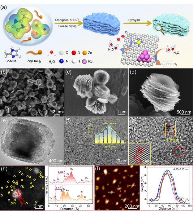 (a) Schematic illustration of synthesis procedure for Ru@Zn-SAs/N-C catalysts, where the electrostatic potential diagram of the iso-surface value is 0.03 e Å-3; (b-d) SEM images with different magnification; (e) TEM image; (f-g) HRTEM images, (f) the inset is the corresponding particle-size distribution of Ru clusters and (g) the inset shows the Moiré images extracted from the FFT; (h) AC HADDF-STEM image and integrated pixel intensities; (i) AFM image and corresponding height profiles of Ru@Zn-SAs/N-C.