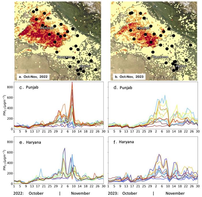 Figure 1. Soon after the kharif/summer crops (mainly rice paddies) are harvested, large number of farm fires are detected from the satellites in late October to November over northwestern India (a:2022, b:2023; top row). A network of about 30 low-cost sensors has been deployed during the intense CRB period since 2022 (black circles in a, b). Our measurements show rural area air pollution in Punjab (c, d; middle row) and Haryana (e, f; bottom row) was significantly caused by paddy crop residue burning in the October-November months for both 2022 (left column) and 2023 (right column). The FDC maps, at 0.05×0.05 degrees grid resolution, are created from Visible Infrared Imaging Radiometer Suite (VIIRS) onboard the SNPP and NOAA20 satellites hotspot detections. The background shows the visible image of earth’s surface.