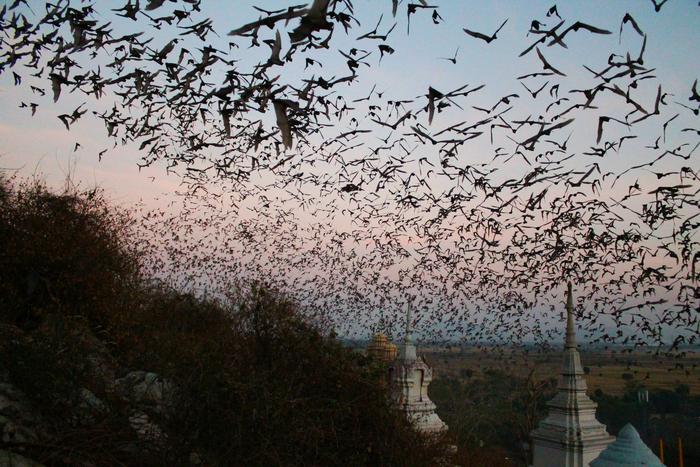 Bats leaving a cave in rural Thailand in the evening to forage for insects in the nearby rice fields