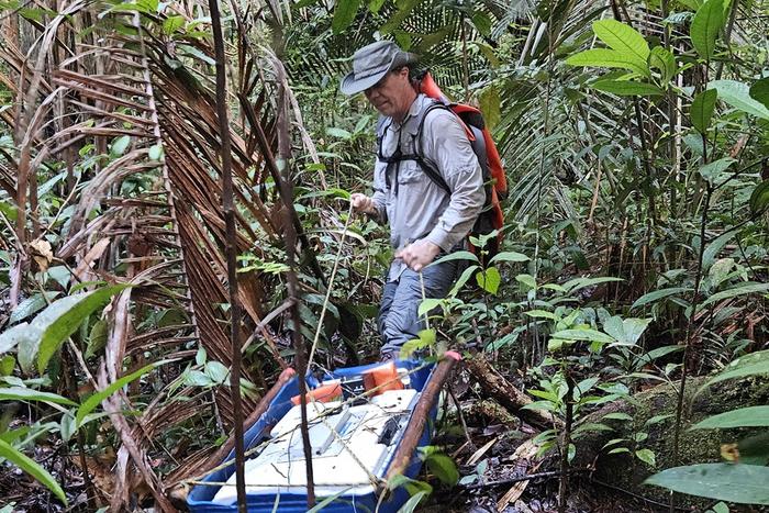 Xavier Comas, Ph.D., main principal investigator, performing a ground-based GPR survey in the Colombian Amazon near InĂrida.