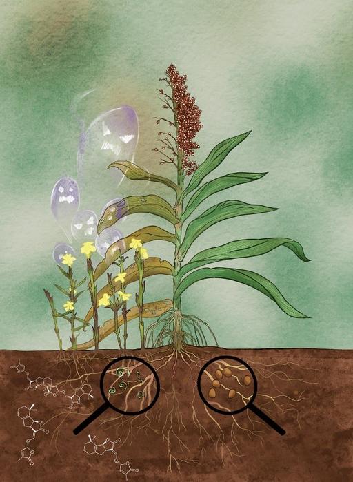 Sorghum is one of the plants susceptible to Striga infestation. Sorghum roots release SLs, a class of plant hormones that help recruit mycorrhizal fungi for nutrient uptake. Unfortunately, Striga seeds dormant in the soil detect these SL signals, which trigger Striga germination and subsequent infestation of the host plant.