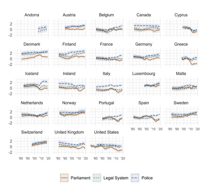 Fig 1: Trends in trust in parliament, the legal system, and the police within Western Europe and North America. Credit University of Southampton