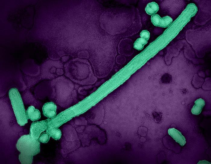 Colorized transmission electron micrograph of influenza A/H3N2 virus particles, isolated from a patient sample and then propagated in cell culture. Influenza A virus particles adapt shape—as filaments and spheres—to help them infect cells depending on environmental conditions. A group of virus particles exhibiting these diverse shapes have been highlighted in teal.