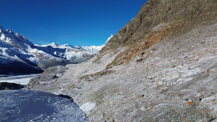 The researchers’ Gornergletscher field site in the Swiss Alps. Left is the glacier and right is their field camp, where the fibre optic interrogator was housed in a tent.