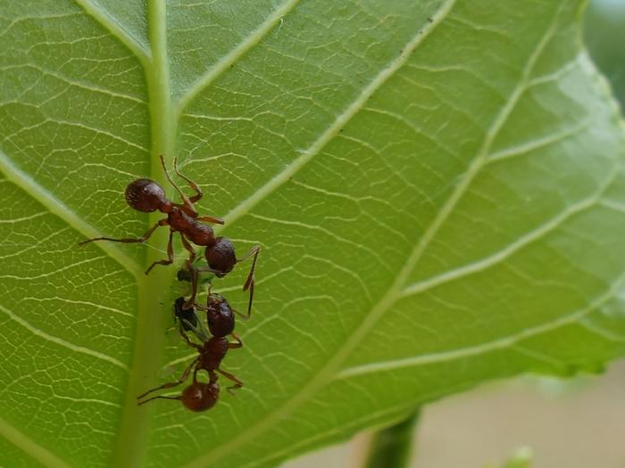 Ants and aphids on a poplar leaf: When aphids infest plants, ants are often also present. The ants do not prey on the small insects, but are interested in their honeydew. In return, they even protect the aphids from predators. Observations showed that fewer ants colonized the poplars when endophytic Cladosporium fungi could be detected inside the leaves. This may be due to the defense substance stachydrine, which the fungi produce and which the aphids excrete with their honeydew.
