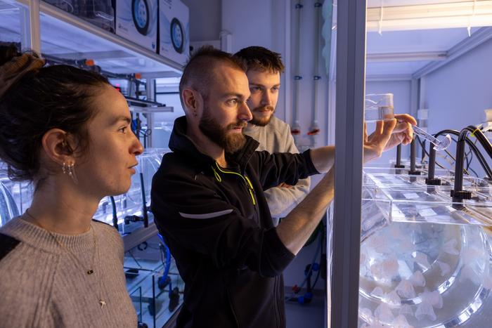 Étienne Bourgouin and Anaïs Courtet, jellyfish curator and jellyfish aquarist at the Paris Aquarium, received training from staff engineer Alexandre Jan on comb jelly husbandry at the Michael Sars Centre.