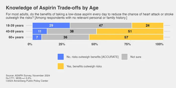 Among U.S. adults with no personal or family history of heart attack or stroke, over 1 in 4 people age 60 and up report regulary taking low-dose aspirin to reduce their risk of heart attack or stroke. Source: Annenberg Public Policy Center's ASAPH survey, November 2024.