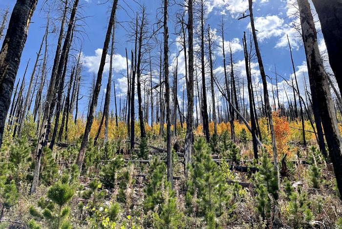 Nine years after the 2012 High Park Fire burned a stand of lodgepole pine that had been severely affected by the mountain pine beetle, lodgepole and aspen saplings were rebounding on this slope in the Arapaho and Roosevelt National Forests. A CSU-led study has found that forests are not regenerating fast enough to keep pace with climate change, wildfire, insects and disease. Photo by Katie Nigro, September 2021
