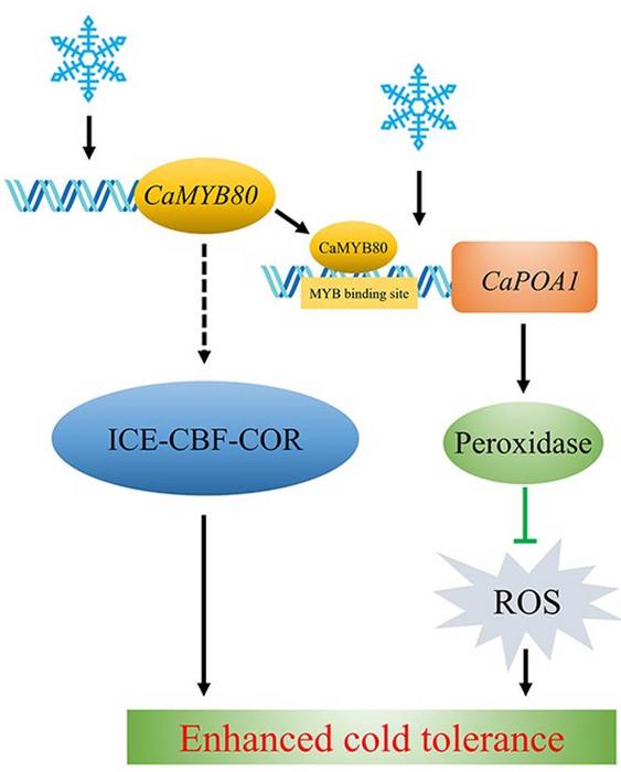 Proposed model through which CaMYB80 enhanced the cold tolerance of pepper by directly targeting CaPOA1.