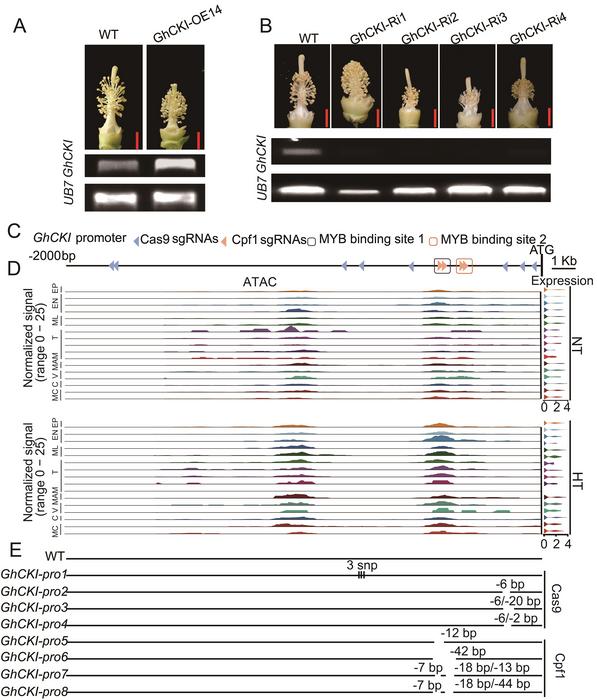 Figure 1:(A). Overexpressing plants of GhCKI showed obvious male sterility. (B) Substantially decreased the expression of GhCKI caused completely sterile in upland cotton. GhUBQ7 (Ghir_A11G011460) was used as control. (C). The distribution of sgRNA target sites cover around 2 kb of the promoter of GhCKI. (D). The accessible chromatin regions of GhCKI promoter in upland cotton anther at the tetrad stage under NT and HT at the single-cell level. The violin plots on the right represent the expression levels of GhCKI in each cell cluster. The single-cell level expression and chromatin accessibility of GhCKI were retrieved from the published integrated multi-omics atlas (RNA+ATAC) of upland cotton anthers. (E). Eight promoter-edited alleles of GhCKI were obtained, respectively. The deletion (−) base pairs are indicated by numbers. EP, epidermis; EN, endothecium; ML, middle layer; T, tapetum; MAM, microspore after meiotic; V, vascular region; C, connective; MC, meiotic cell; NT, normal temperature; HT, high temperature.