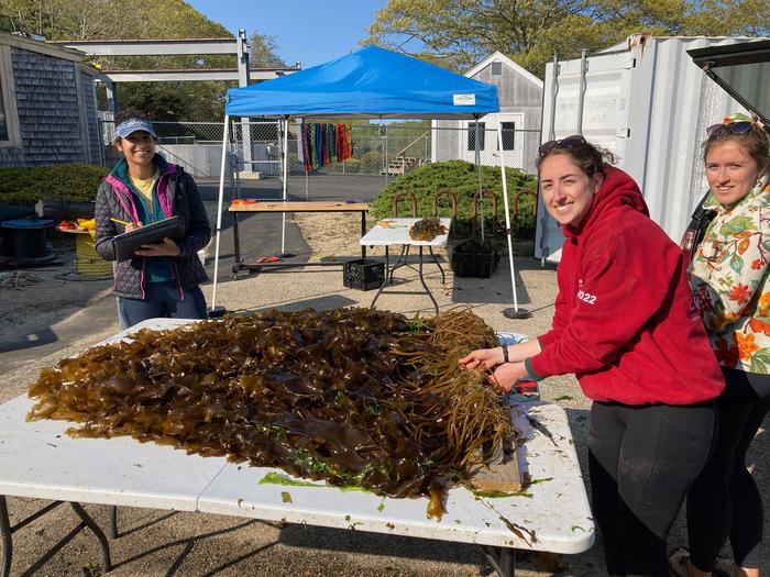 Adult sporophytes are harvested from an ocean farm in New Hampshire. Theresearchers will useresults from their heat-stress experiments to breed kelp that can toleratewarming ocean temperatures.