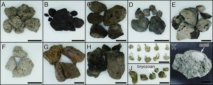 From A to H, light-gray pumice, black pumice, brown pumice, gray-banded pumice, black-and-white-banded pumice, white pumice, pink pumice, and obsidian-bearing pumice. I, J, and K show goose barnacles, bryozoans, and coral. Scale bars in A-J are 50 mm; scale bar in K is 10 mm.