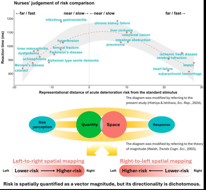 Tokyo, Japan – Researchers from Tokyo Metropolitan University have studied how nurses perceive words showing high and low risk ailments. They looked for directional bias, e.g. whether words denoting lower (higher) risk led to a quicker response when placed on the left (right) side or vice versa. They found faster response for significantly higher or lower risk, but different people had different directional biases. Their findings might inform better ways to present clinical information.
