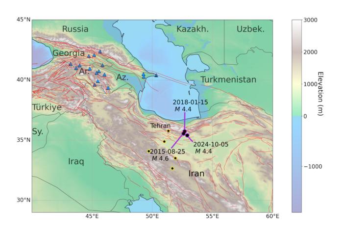 Triangles mark seismometers used to study the Oct. 5, 2024, earthquake, along with two similar events identified by the Comprehensive Test Ban Treaty Organization. The 2015 event shares a nearly identical seismic pattern with the 2024 earthquake. Key Iranian nuclear facilities are shown as yellow and black dots. Red lines indicate major fault zones.