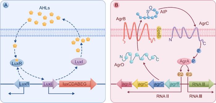 Representative QS systems of Gram-negative (A) and Gram-positive (B) bacteria. For Gram-negative bacteria, the AIs are AHLs, which are encoded by luxI. Upon reaching a threshold, AHLs bind to LuxR, subsequently activating the expression of genes involved in the production of virulence factors. For Gram-positive bacteria, the AIs are AIP, which is encoded by argD. Upon reaching a threshold, AIP binds to ArgC, subsequently activating the expression of virulence-related genes.