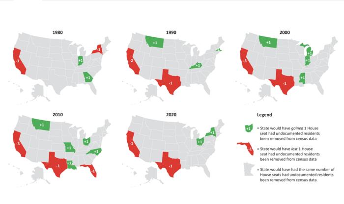 Change in Apportionment if Undocumented Residents Were Removed from Census Data Used for Apportionment, 1980-2020.
