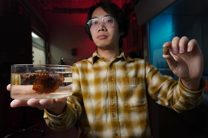 University of Chicago Pritzker School of Molecular Engineering PhD candidate Changxu Sun holds up a small malva nut and a submerged one to demonstrate how much it swells in water. Sun is harnessing this “natural hydrogel” to create new medical devices.