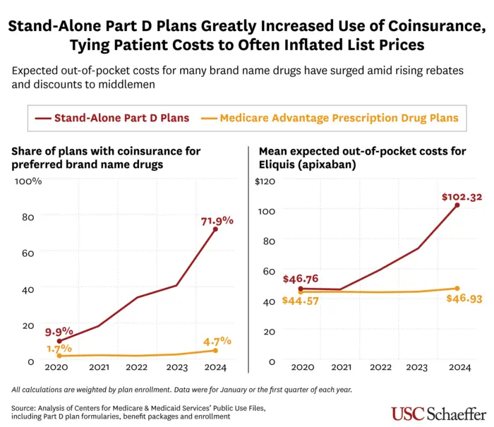 Over that time, Eliquis’s average expected out-of-pocket costs for beneficiaries in stand-alone Part D plans more than doubled, from $46.76 to $102.32, as the share of plans using coinsurance for the drug increased from 10.7% to 75%.