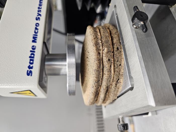 WSU scientists used different lab equipment, like this one that evaluates texture, to measure the impact of using different ratios of whole wheat flours in pancakes.