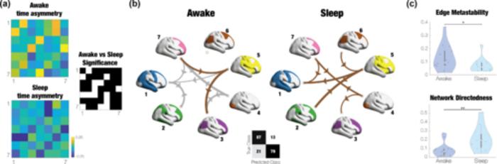 (a) The two matrices of the shifted functional connectivity between seven manifold networks reflect different interactions in wakefulness (top) and deep sleep (bottom). Importantly, there are significant differences (white squares) between the two matrices (p<0.05). (b) These time asymmetries are illustrated (for the top 20%) of arrows between the seven manifold networks for awake vs sleep, where the grey arrows correspond to negative and brown to positive interactions, and their thickness to the value of these interactions. As can be seen the flow of interaction is very different for wakefulness compared to deep sleep. Machine learning was able to separate these interactions with an accuracy of 84%. (c) The spatiotemporal characteristics in the CHARM latent space can be captured by the Edge metastability which is significantly different between awake and sleep (upper panel, p<0.05). Similarly, the reconfiguration of the hierarchical information flow is captured by the measure of network directedness of the shifted functional connectivity of the manifold network, which is also significantly different between awake and sleep (lower panel, p<0.01).