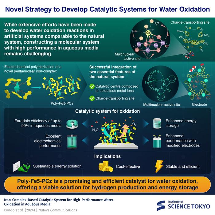 A newly developed pentanuclear iron complex (Fe5-PCz(ClO₄)₃) can offer an efficient, stable, and cost-effective solution for water oxidation. By electrochemically polymerizing the complex, researchers from Institute of Science Tokyo obtained a polymer-based catalyst, poly-Fe5-PCz, and achieved water oxidation with up to 99% Faradaic efficiency and exceptional stability, even under rigorous conditions. This breakthrough offers a scalable alternative to rare metal catalysts, advancing hydrogen production and energy storage for renewable energy.