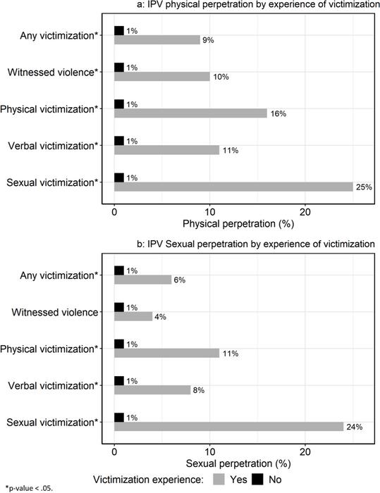 a) IPV (intimate partner violence) physical perpetration by experience of victimization. b) IPV sexual perpetration by experience of victimization.