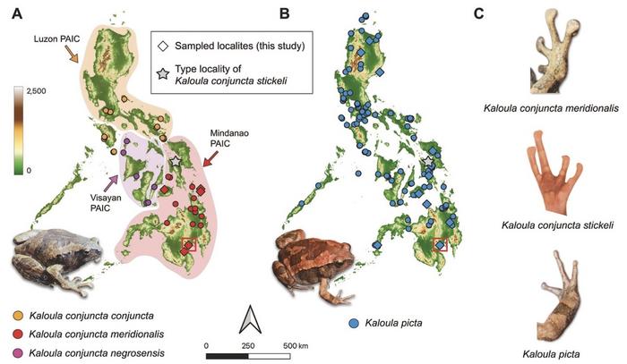 Distribution of the frogs studied and examples of their finger disc widths. Distribution of the Kaloula conjuncta complex A and B K. picta. Diamond = location of samples sequenced for this study; star = type locality of K. c. stickeli; red box = location of the putative hybrid zone where K. c. meridionalis, K. c. stickeli, and K. picta co-occur. C Differences in widths of the finger discs in the focal taxa.