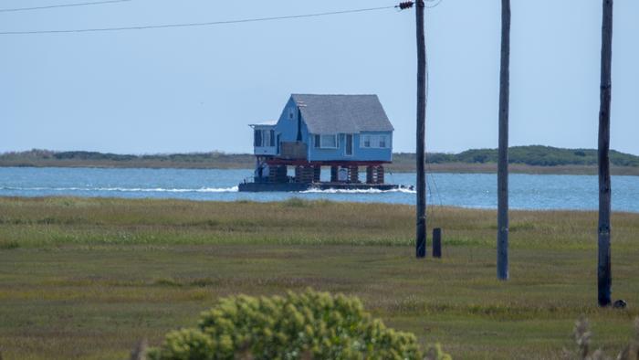 A house, being relocated to higher ground, is transported by barge through Little Egg Inlet along New Jersey’s southeastern coast.