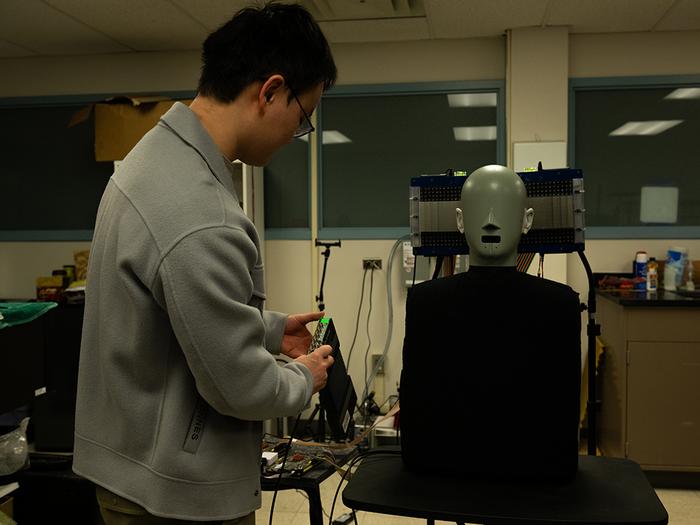 Jia-Xin "Jay" Zhong, a postdoctoral scholar of acoustics at Penn State, used a dummy with microphones in its ears to measure the presence or absence of sound along an ultrasonic trajectory.