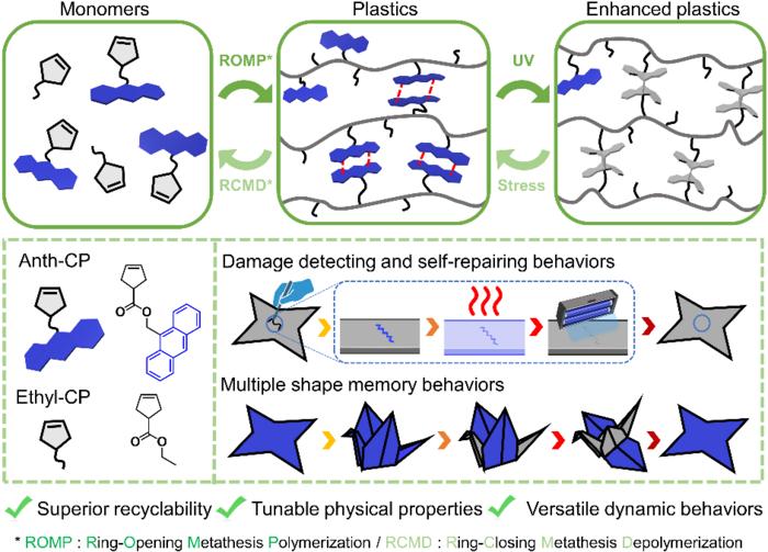 The newly developed polymer is easy to manage, as it exhibits fluorescence at damaged sites, enabling real-time damage detection, and self-heals when exposed to heat and light. Upon disposal, this material can selectively depolymerize into its monomers, even when mixed with conventional plastics. The recovered monomers can then be used to regenerate polymers that retain their original properties. These features present an innovative solution for enhancing both sustainability and recyclability of polymeric materials.
